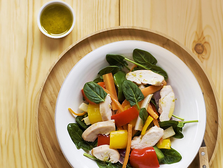 - Leikkaa kypsät broilerit viipaleiksi ja nosta ne porkkanoiden ja paprikoiden kanssa pinaatinlehtien päälle.