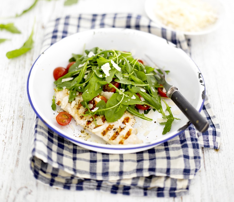 - Riivi, huuhtaise ja kuivaa rucola. Puolita kirsikkatomaatit ja yhdistä rucolaan. Sekoita öljy ja etikka keskenään. Mausta seos suolalla ja pippurilla. Kaada kastike salaatille ja lisää parmesaanilastut. Annostele salaatti rintafileille. Tarjoa heti.
