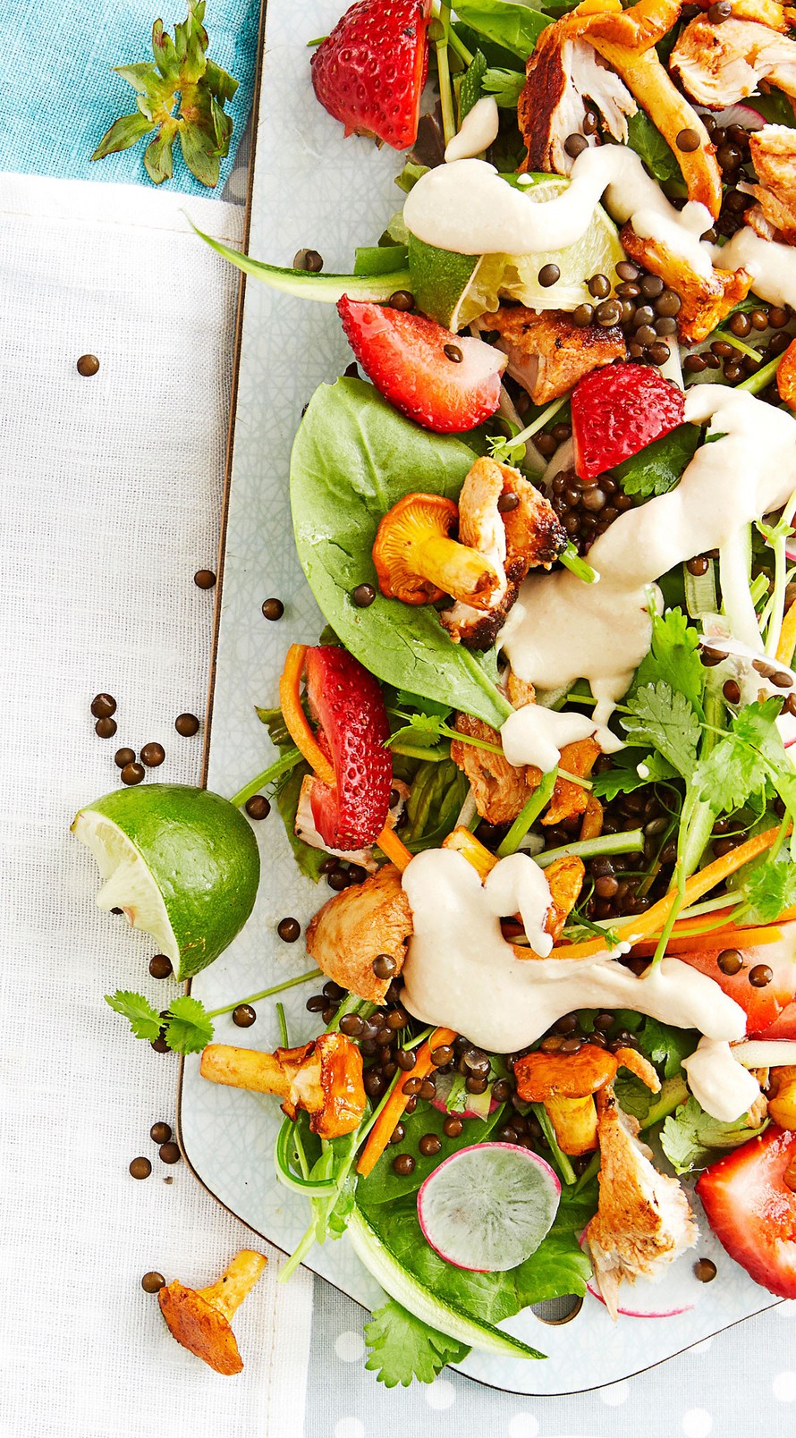 Ruokaisa salaatti syntyy valmiista grillibroilerista ja kypsistä linsseistä. Kokonaisuus raikastuu mansikoilla ja saa hunnukseen täyteläistä cashew-jogurttikastiketta.