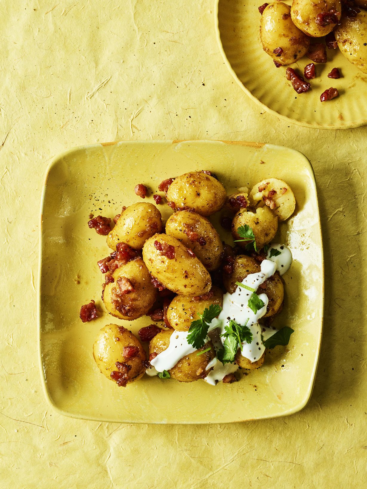 - Kääntele kastike ja pekonit perunoiden joukkoon. Kaada päälle jogurtti ja hienonna korianteri salaatin pinnalle.