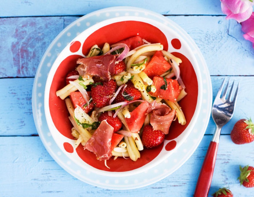 Pastasalaatin yllättävät sattumat ovat kinkkua, mansikoita ja melonia.