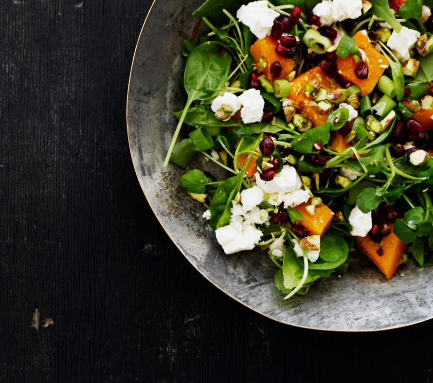 Paahdettua kurpitsaa, fetaa ja granaattiomenaa. Tämä hienostunut salaatti sopii viikonloppupöytään!
