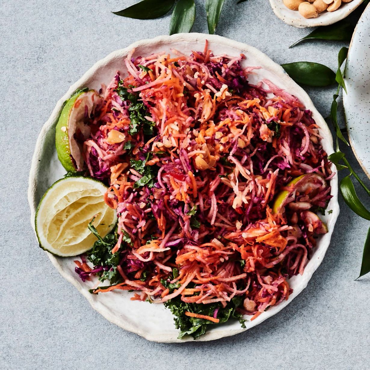 - Pese porkkanat ja lanttu hyvin juuresharjalla. Leikkaa kannat pois ja raasta raastimen karkealla terällä. Hienonna kaali. Puolita chilit ja poista siemenet, jos haluat vähentää tulisuutta. Kuori valkosipulinkynsi ja lohko limetit neljään osaan.
