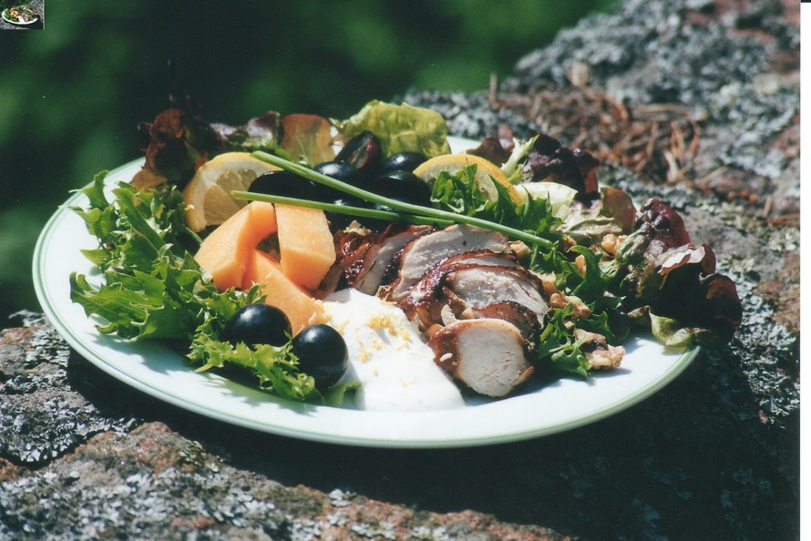 Salaatti marinoidusta savubroilerista ja sitruunakastike