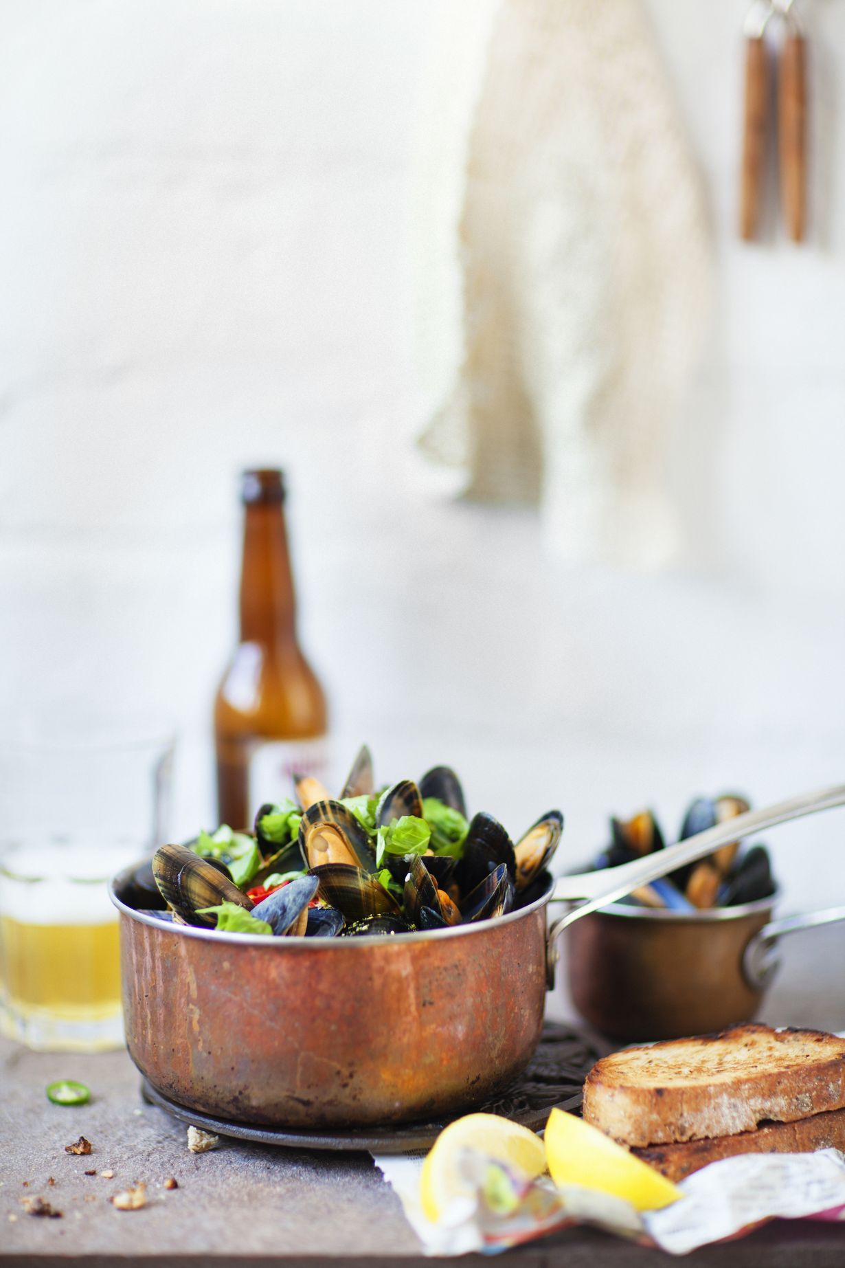 1. Pese simpukat huolellisesti kylmällä vedellä ja juuresharjalla. Poista simpukat, jotka eivät sulkeudu kopauttaessa. Laita puhtaat simpukat jääkaappiin odottamaan liemen valmistusta.