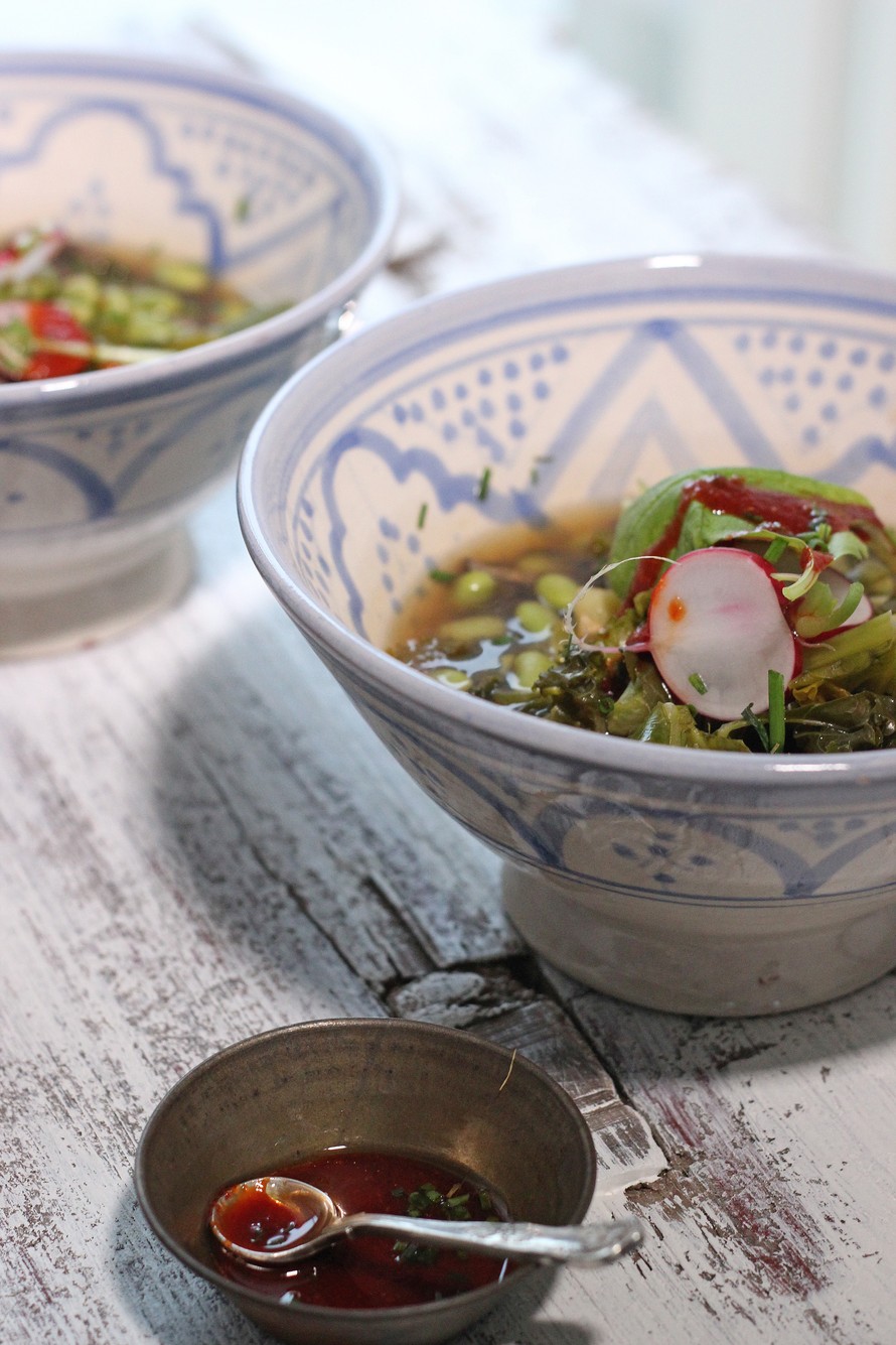 Kun keitto on valmis, paloittele tuoretta retiisiä sen päälle ja hyvin pesty lehdet, sillä niissä on paljon lisämakua! Ripottele lisää ruohosipulia/korianteria ja laita reilu lusikallinen tulista kastiketta!