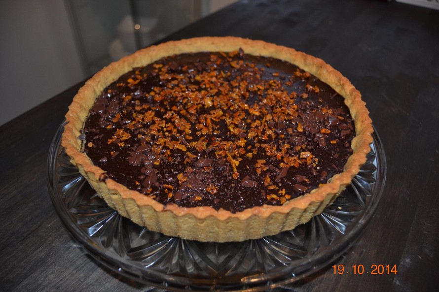 Kuumenna kerma paksupohjaisessa kattilassa. Lisää murskattu suklaa kuumaan seokseen ja sekoita hyvin, mutta älä keitä. Lisää hyvin pestyn appelsiinin kuori. Lisää sitten kananmunat seokseen yksitellen hyvin sekoittaen.
