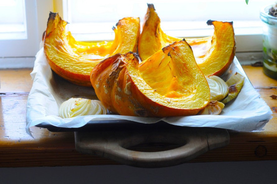 Kuori sipulit ja halkaise ne. Puolita kurpitsa. Kaavi siemenet ja mössö siementen ympäriltä, ota siemenet talteen. Sivele puolikkaat oliviiöljyllä ja laita ne uunipellille leivinpaperin päälle uuniin 200 asteeseen paahtumaan sipulien ja valkosipulien kanssa noin puoleksi tunniksi.