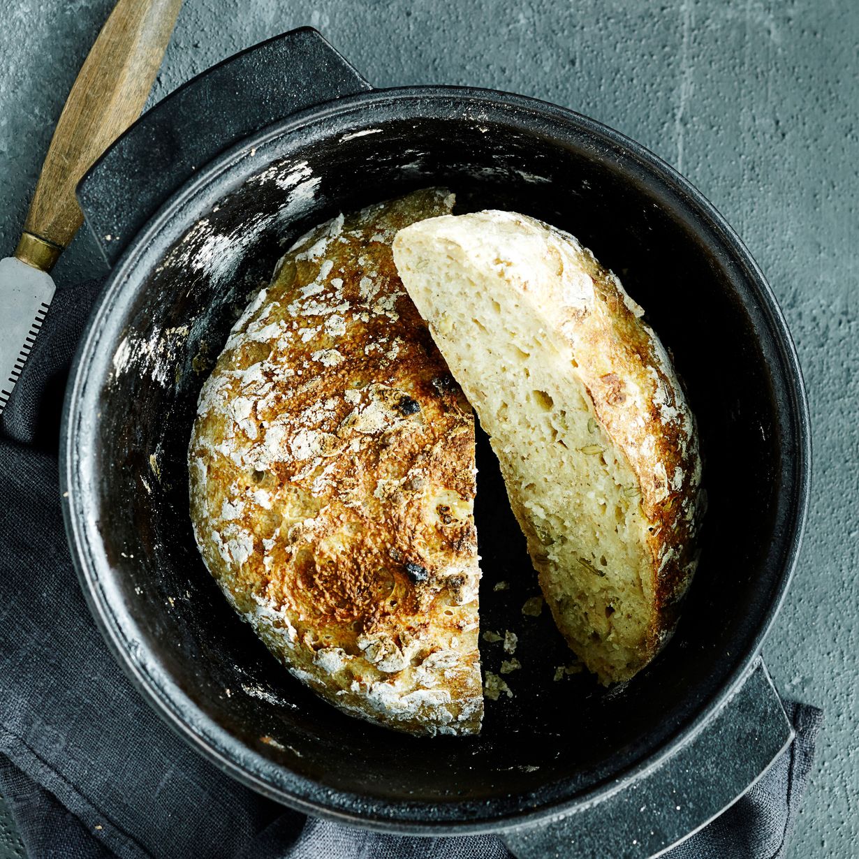 - Paista leipää 25 minuuttia. Ota kansi pois jatka paistamista noin 20 minuuttia, kunnes leipä on kypsä ja saanut väriä.