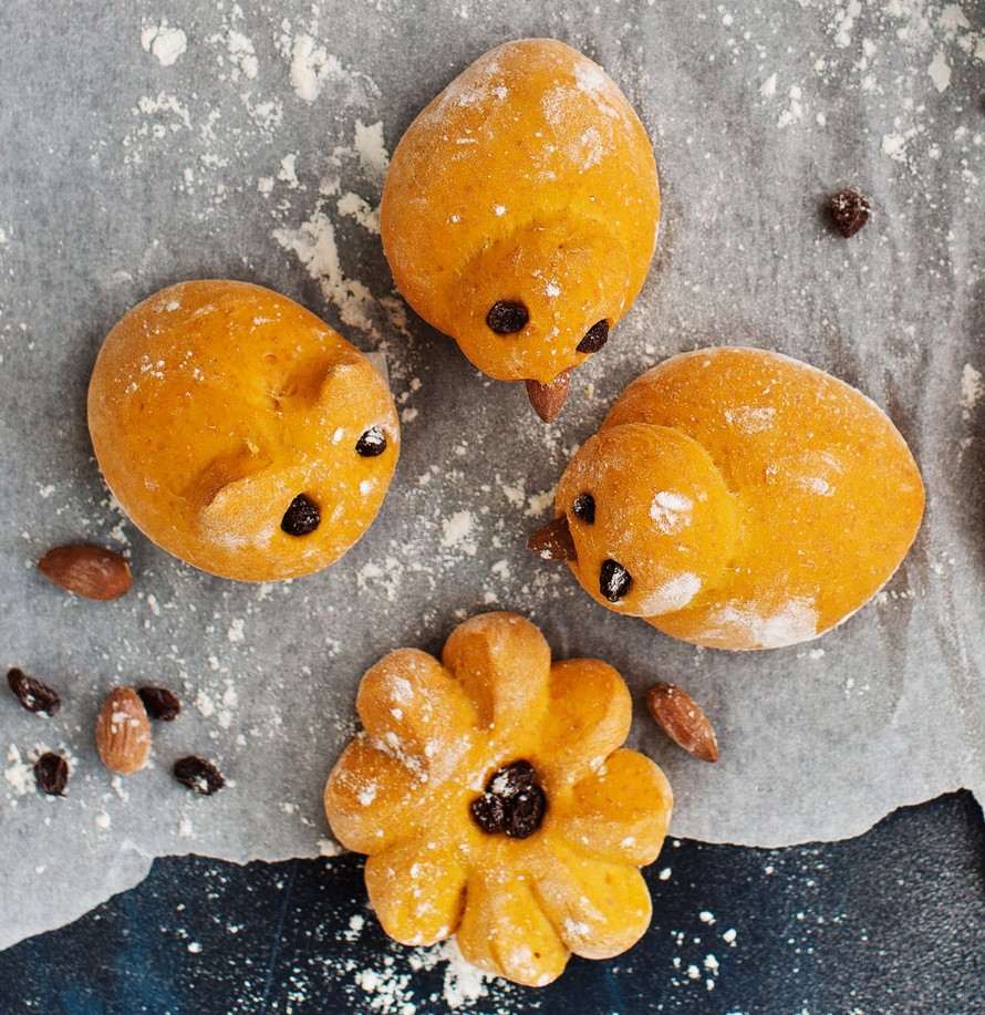 Sämpylätaikinasta tulee pirteän oranssi, kun leivot sen porkkanamehuun. Muotoile taikinasta hauskat tipun, kissan ja kukan muotoiset leipäset.