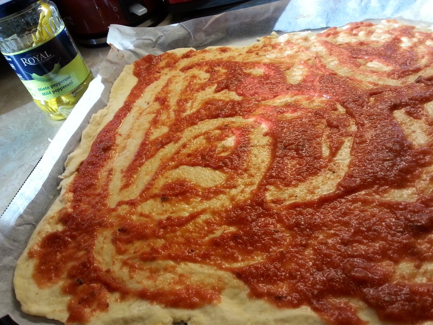 Tämä pohja on ns. yksi peruspitsa. Tuplaa annos, niin saat pellilllisen. Muista lisätä jauhoja, jos pohja on takertuvaa sorttia. Valkosipulijauheen voi jättää mainiosti pois, jos ei tykkää.