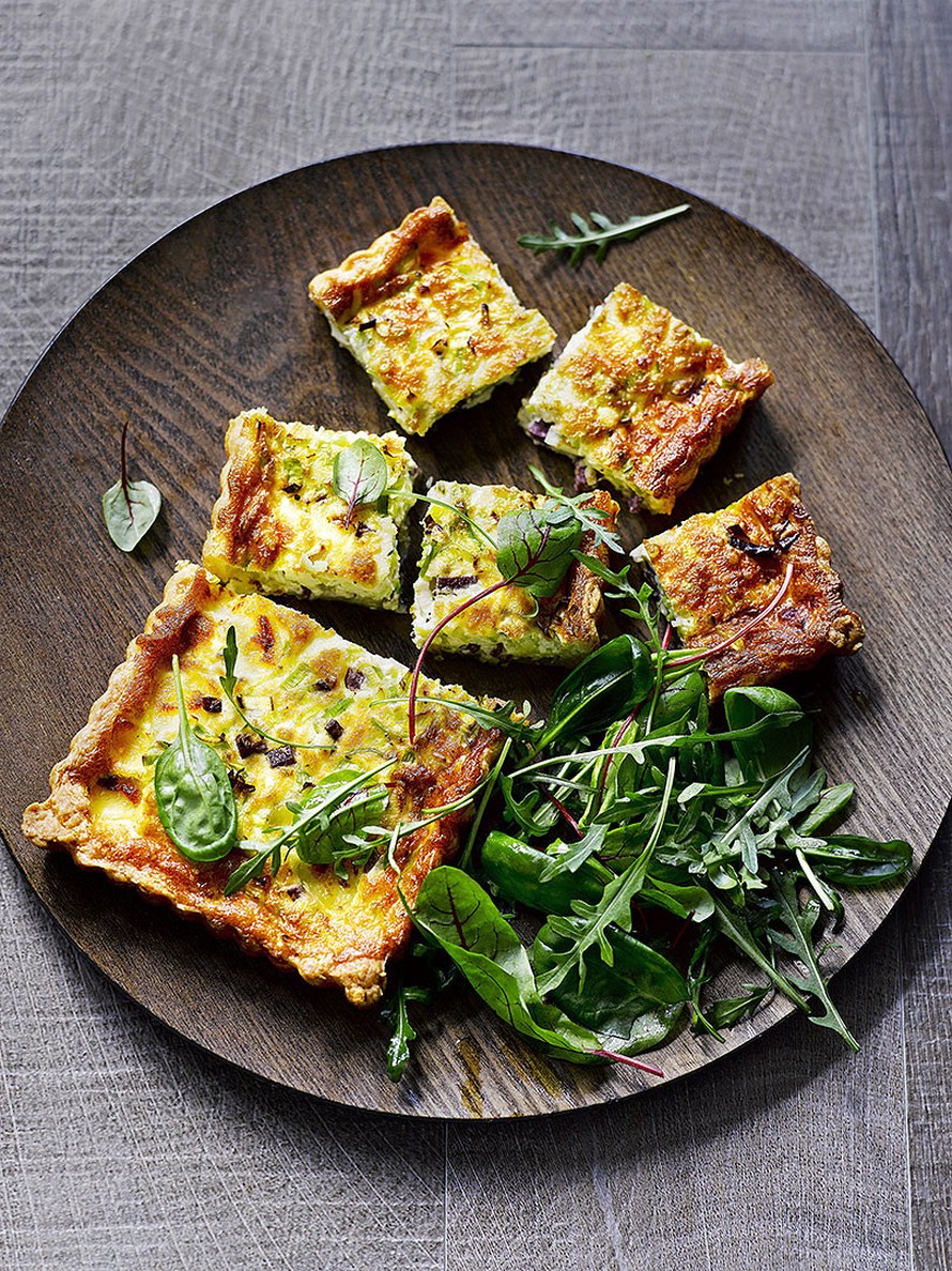 - Painele taikina piirasvuokaan (halkaisija noin 26 cm). Levitä purjo, juusto ja poro pohjalle ja kaada päälle muna-kermaseos.