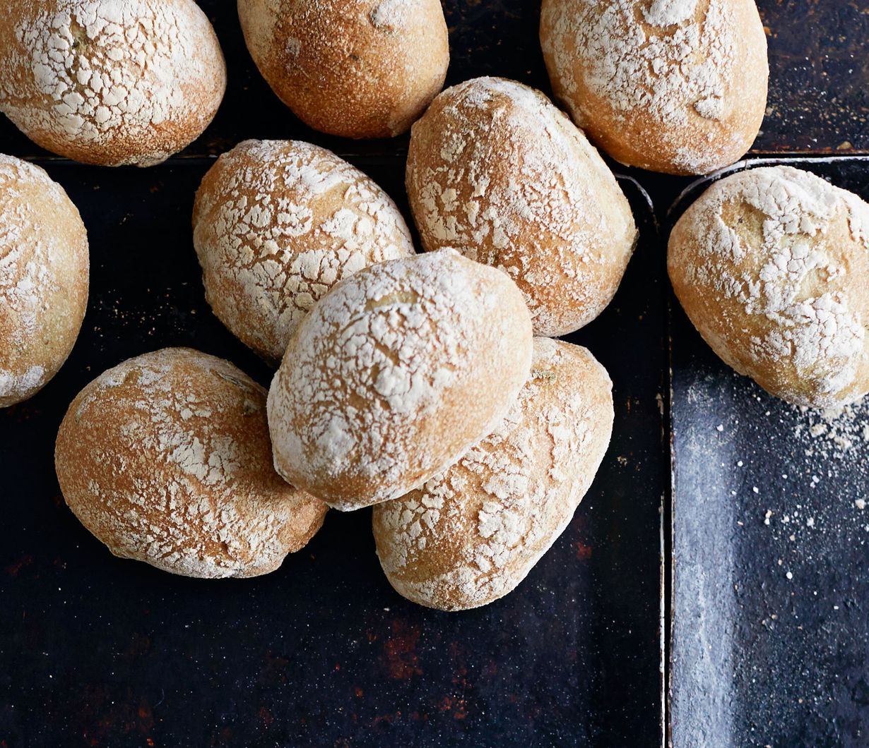 - Paista leipiä ensin 250 asteisessa uunissa 5 minuuttia. Laske uunin lämpötila 200 asteeseen ja paista leipiä vielä 6–7 minuuttia. Pirskota välillä vettä uunin pohjalle, niin saat sämpylöihin rapeamman kuoren.
