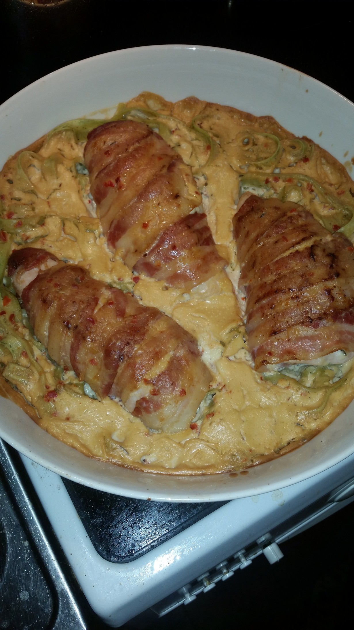 Täytetyt broilerin fileet pekoniin käärittynä ja kermaista pinaattituorepastaa