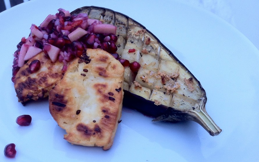 Uunissa grillattua munakoisoa, halloumijuustoa ja granaattiomenasalsaa