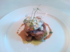 Valkosipulilammasta pestoperunoiden ja tsatsikin kera