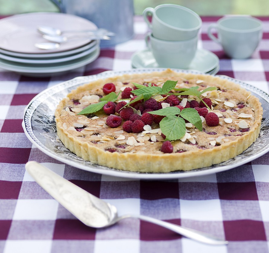 Ripottele piirakkapohjalle suklaarouhetta ja vadelmia. Levitä mantelitäyte päälle ja koristele mantelilastuilla.