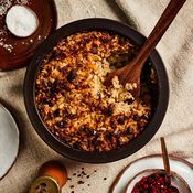 Herkullinen pinta syntyy erilaisten juustojen yhdistelmästä. Ohjeessa on vinkki, kuinka juustoraasteesta saa kananmunan avulla kuohkean kuorrutuksen.