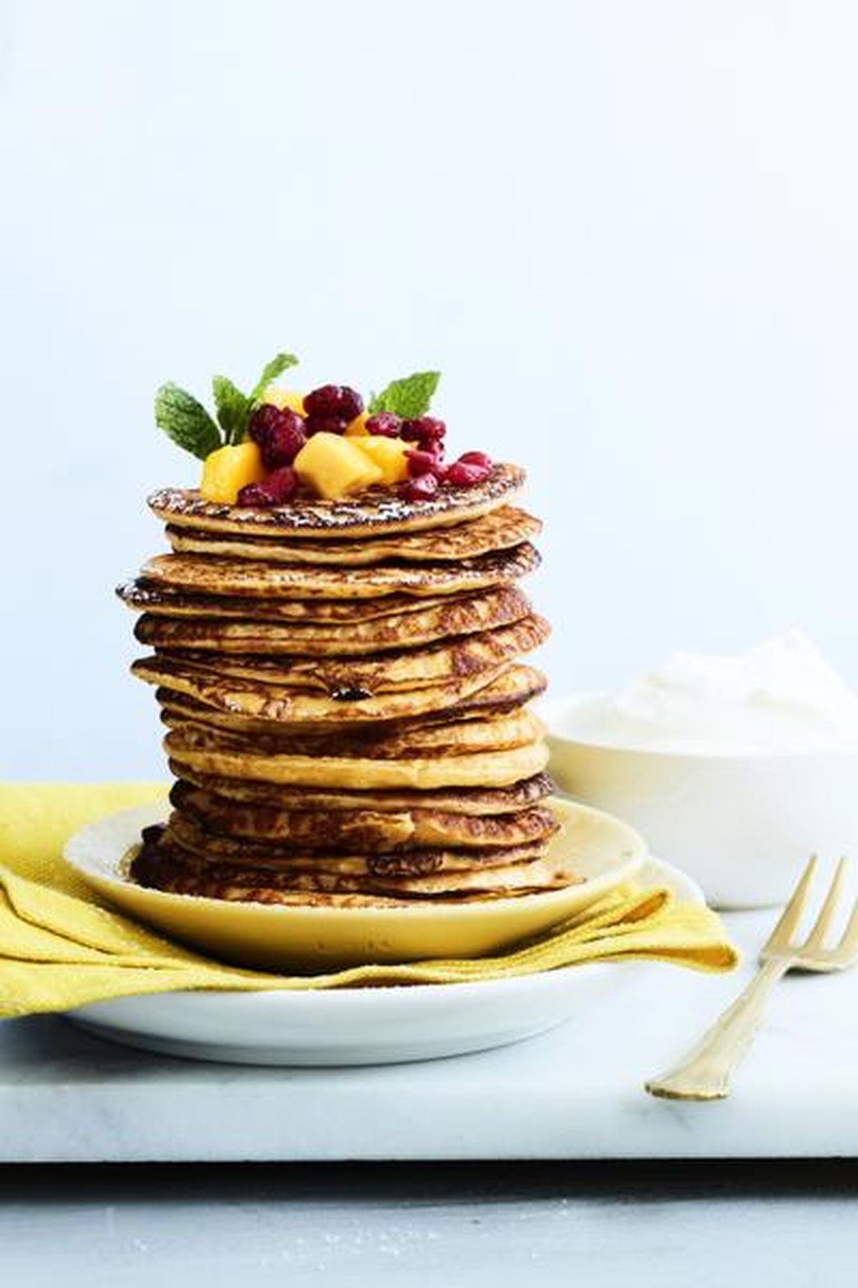 - Halkaise granaattiomena ja irrota siemenet. Halkaise ja paloittele mango. Sekoita rahkan joukkoon sokerit. Tarjoa hedelmät ja vaniljarahka räiskäleiden kanssa.