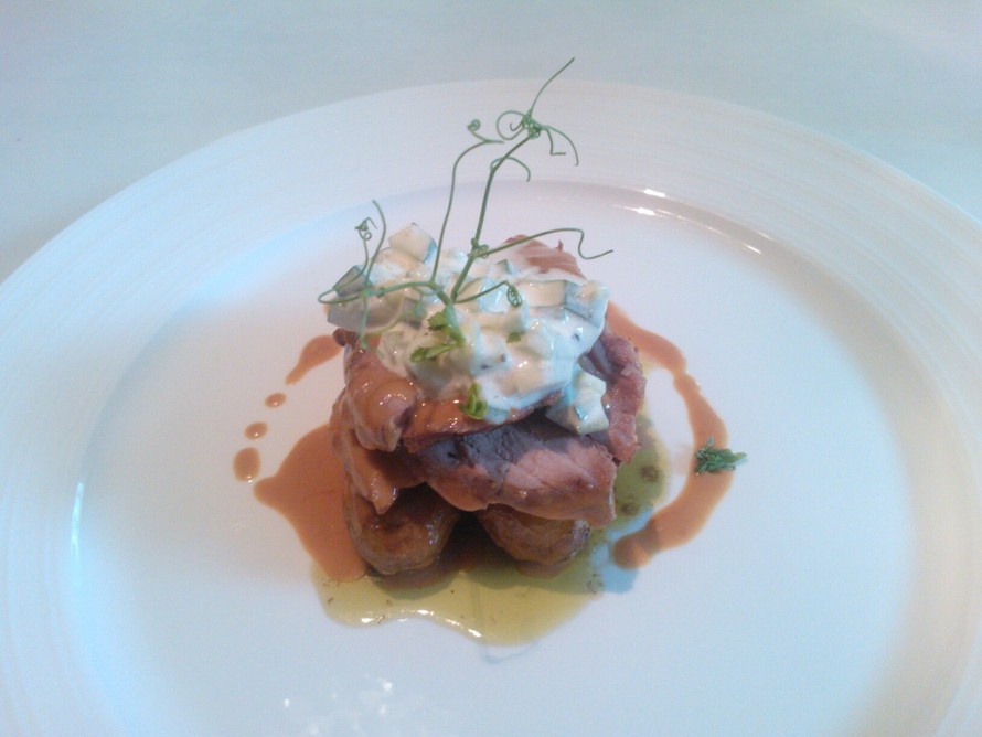 Valkosipulilammasta pestoperunoiden ja tsatsikin kera