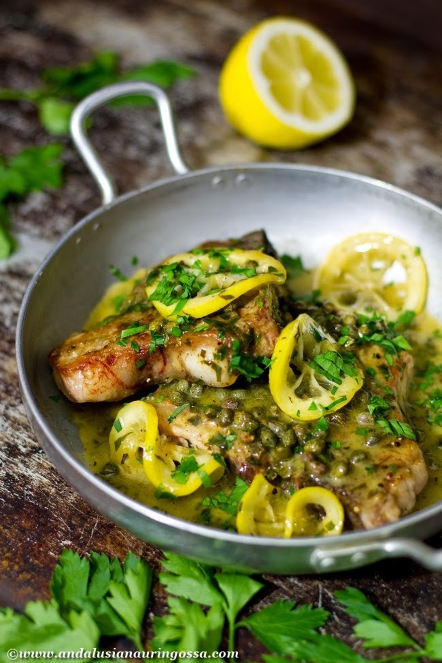 Nostettuasi liha pannulta, kaada sinne valkoviini ja sitruunamehu. Anna kiehahtaa ja lisää pannulle sitten sitruuna, kaprikset ja voi. Keitä muutaman minuutin ajan, lisää joukkoon silputtu persilja, tarkista maku ja mausta. Kaada lihan päälle ja tarjoile. Joko pastan tai vaikka voipapumuusin kanssa.
