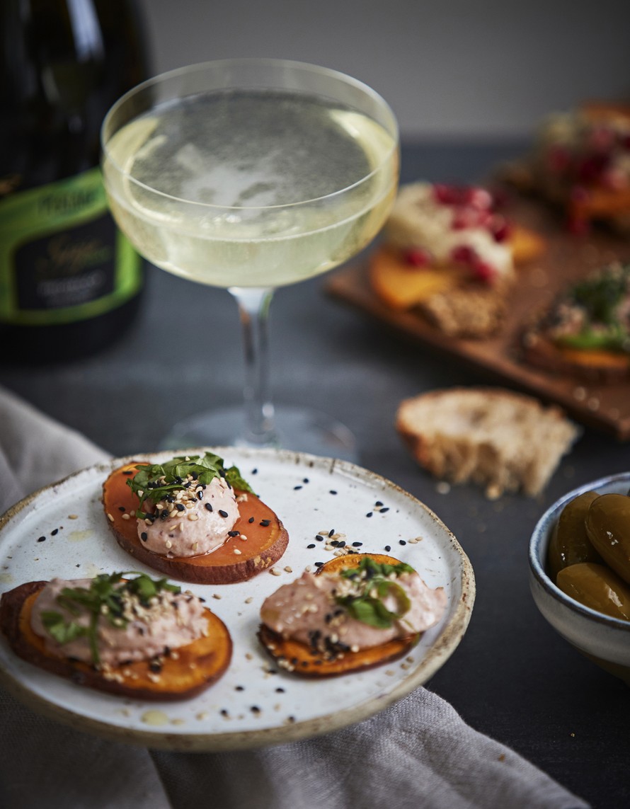 Hurauta hummukseen pakastekarpaloita, ja lusikoi se meheväksi täytteeksi bataattikiekkojen päälle. Tarjoa vegaaniset suupalat hedelmäisen Perlage Sgàjo Proseccon kanssa.