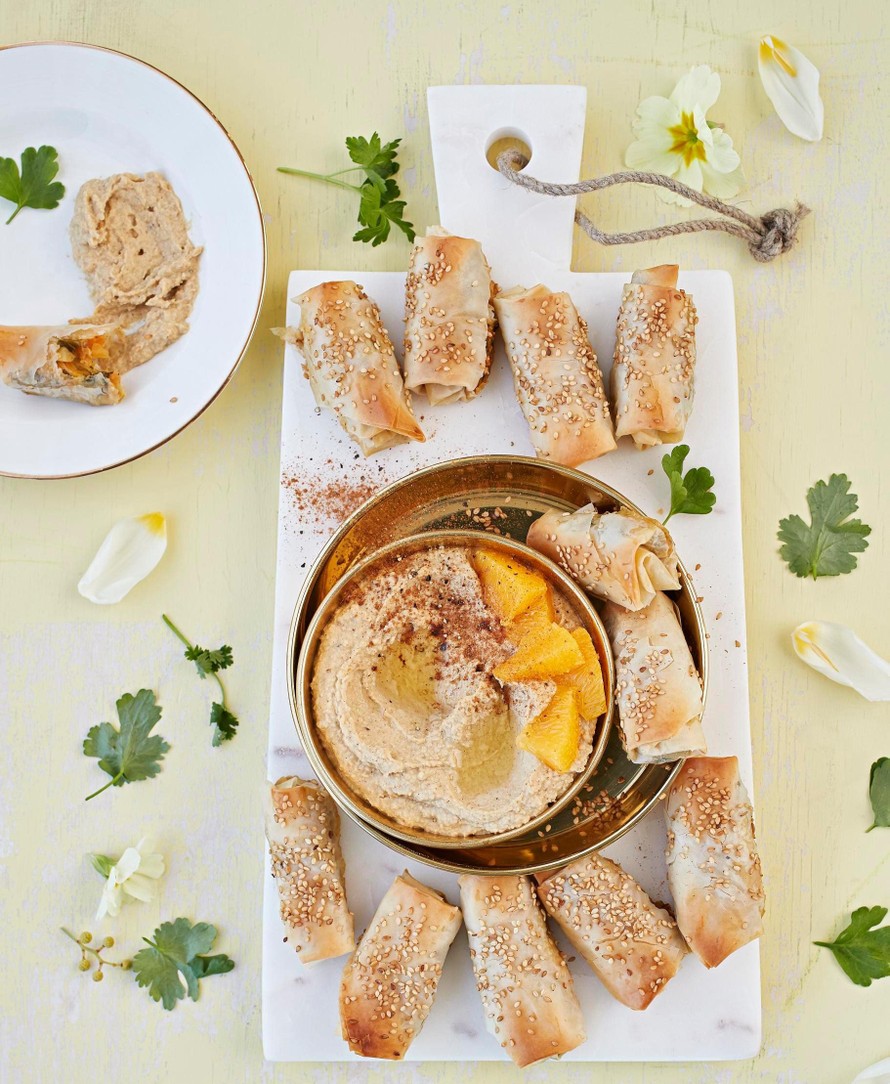 Ihanissa filorullissa maistuvat tahini, yrtit ja kasvikset. Kasta appelsiinihummukseen ja haukkaa. Hummuksen reseptin löydät tästä.