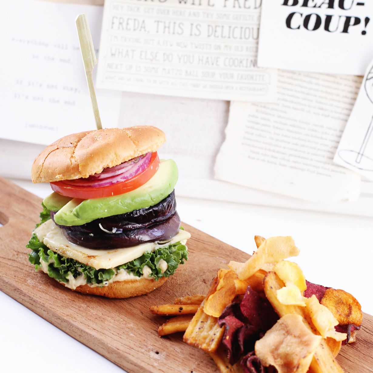 Kokoa tuhdit kasvisburgerit ja viimeistele kerrokset vegaanisella juustolla. Kastikkeena toimii cashewtahna ja hummus.