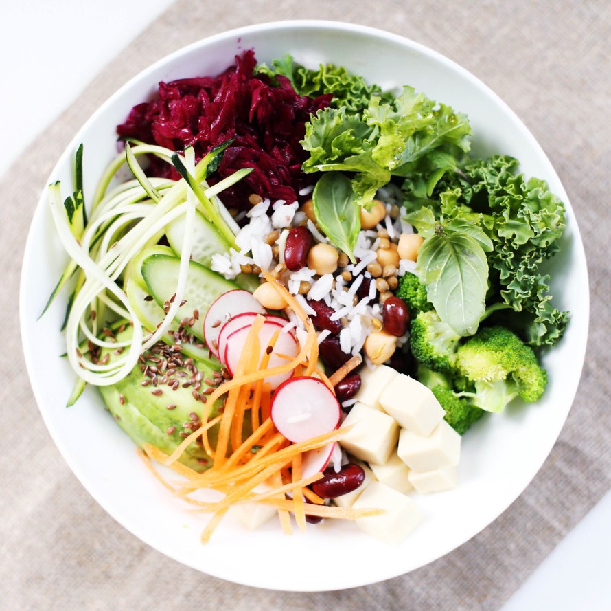 - Rakenna salaattiin eri värisiä osioita raastettua punajuuresta, kesäkurpitsasta, avokadosta, retiiseistä, porkkanoista, parsakaalista ja kurkusta.