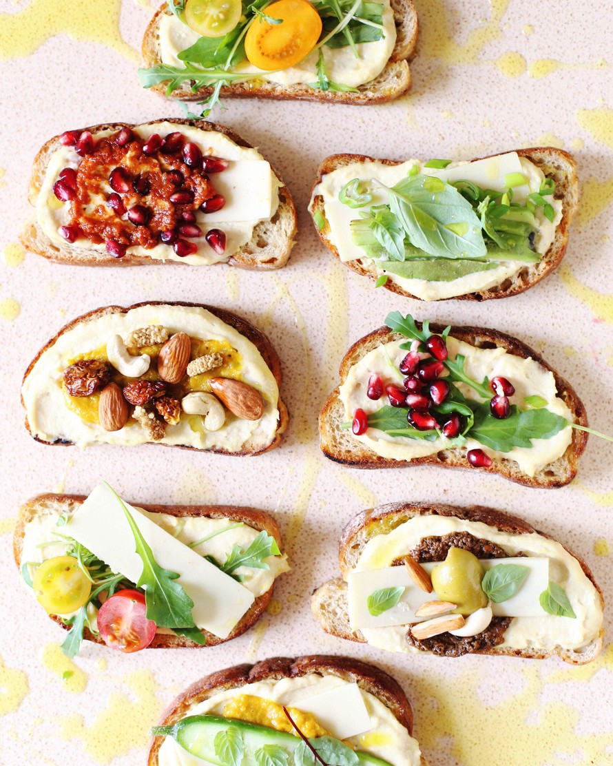 Kasaa naposteltavaksi tarjotin täyteen värikkäitä hummusleipiä. Viimeistele simppelit leivät herkullisella vegejuustolla.