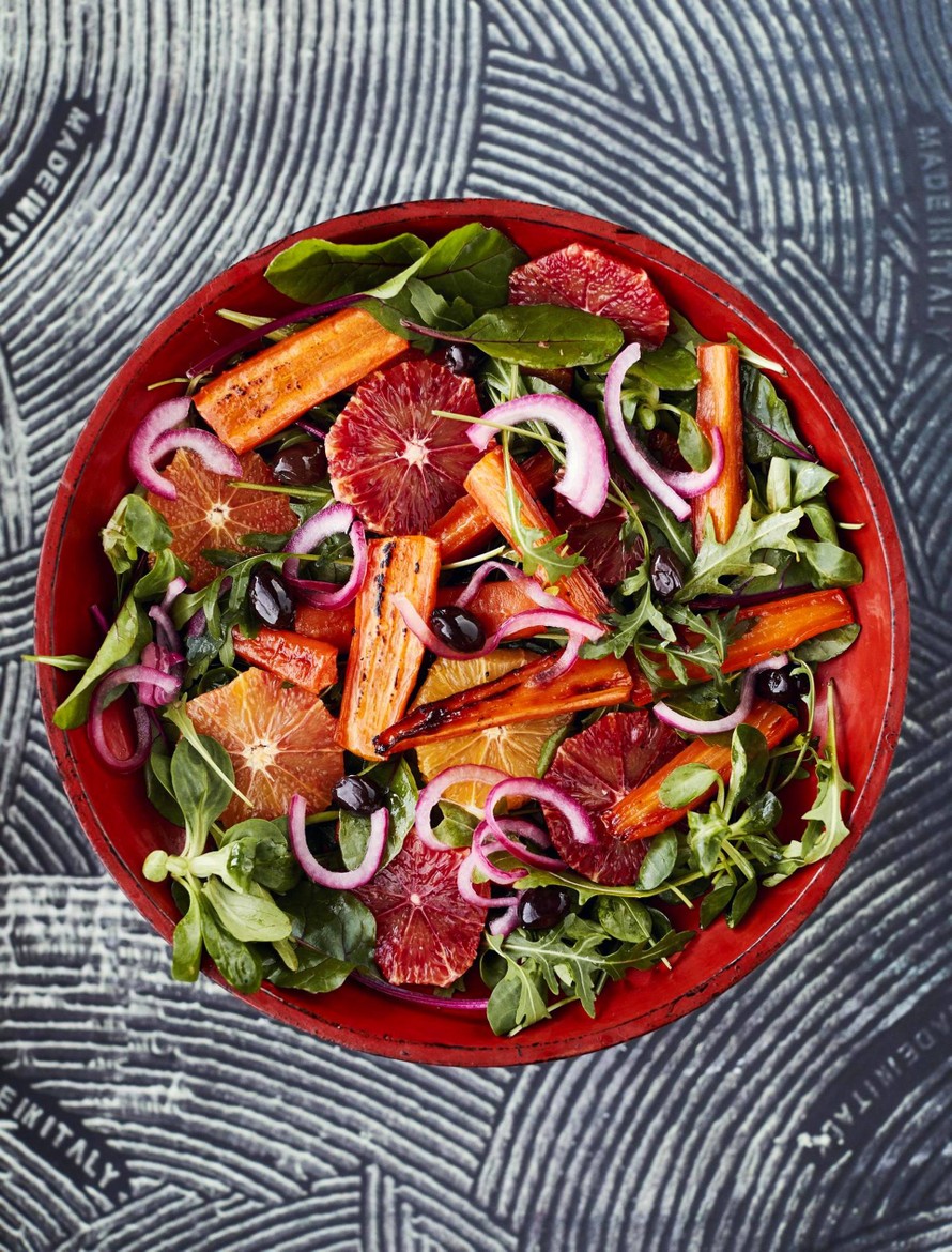 Paahdettuja porkkanoita, veriappelsiinia ja marinoitua punasipulia. Talven värikkäin salaatti maistuu alkuruokana ja vaikka paistetun lohen kanssa.