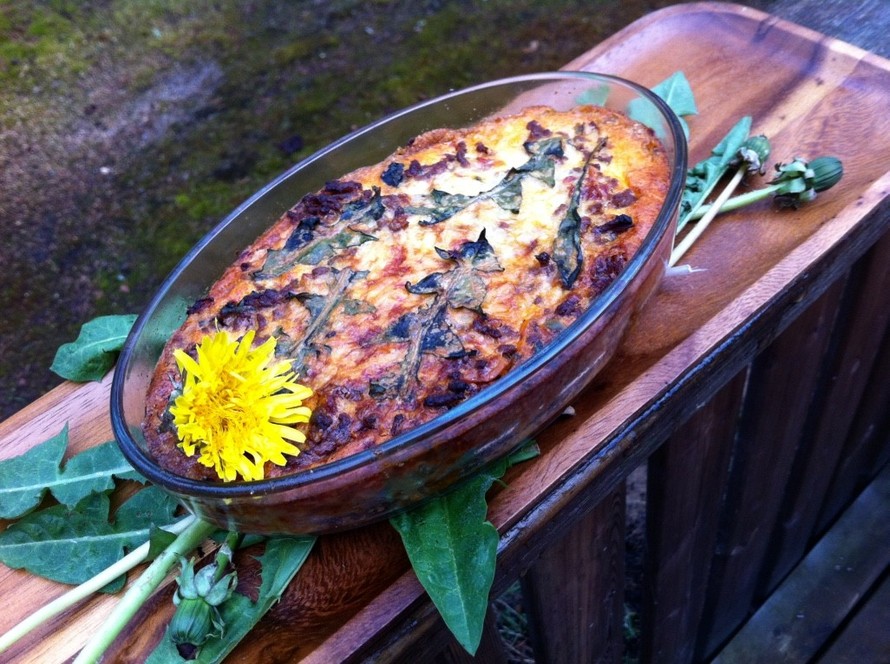 Viime päivät minulla on kulunut uuden alkavan harrastuksen parissa hortoilessa luonnossa tutustuen villikasveihin ja -yrtteihin. Hortoiluretkillä tuli heti koettua jännittäviä hetkiä, sillä astuin melkein sihisevän kyykäärmeen päälle! Ehkä tämän metsäläistyvän kaupunkilaisen olisi aika hankkia kumisaappaat..Pohjois-Pohjanmaan leveyksillä luonto ei vielä kukoista, mutta voikukkaa puskee jo jonkin verran. Voikukka pääsi siis tähän reseptiin, mutta sen voi halutessaan korvata rucolalla. Voikukka sisältää kuitenkin todella paljon vitamiineja, kalsiumia, rautaa ja se puhdistaa maksaa, joten suosittelen maistamaan. Meillä tästä uskomattomasta vitamiinipommista valmistui hieman erilainen äitienpäivän suolainen piirakka. Piirakka on lihaisa, kuohkea ja maukas, oikein sopiva juhlapöytään suolaisen rooliin vaikkapa raikkaan salaatin seuraksi.