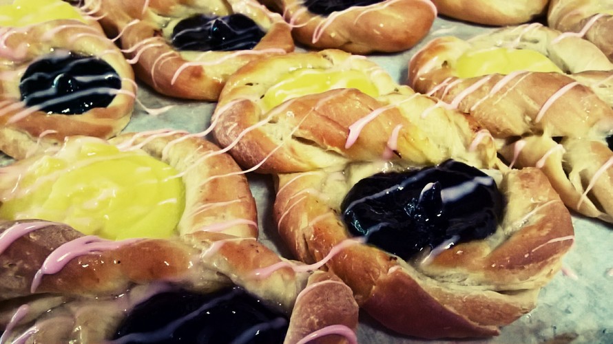 Kauli lopuksi 1 - 1 1/2 cm:n vahvuiseksi levyksi (20 x 40 cm). Leikkaa siitä 22 sormenvahvuista, 20 cm:n pituista nauhaa. Venytä nauhaa hiukan pituussunnassa, pyöräytä päistä kierteelle ja kietaise 8 muotoon. Anna kohota mieluiten viileässä noin tunnin ajan.