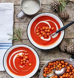 Tulinen tomaattikeitto ja paistetut kikherneet