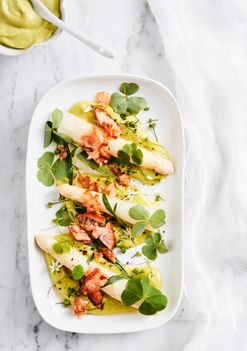 Laukkabéarnaise, valkoista parsaa ja savulohta