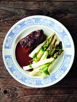 Ylikypsä karitsa, parsat ja suklaa-punaviinikastike