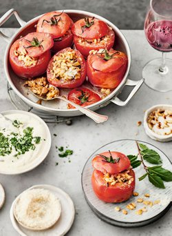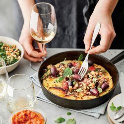 Perunamunakas, lämmin munakoisosalaatti ja romescokastike
